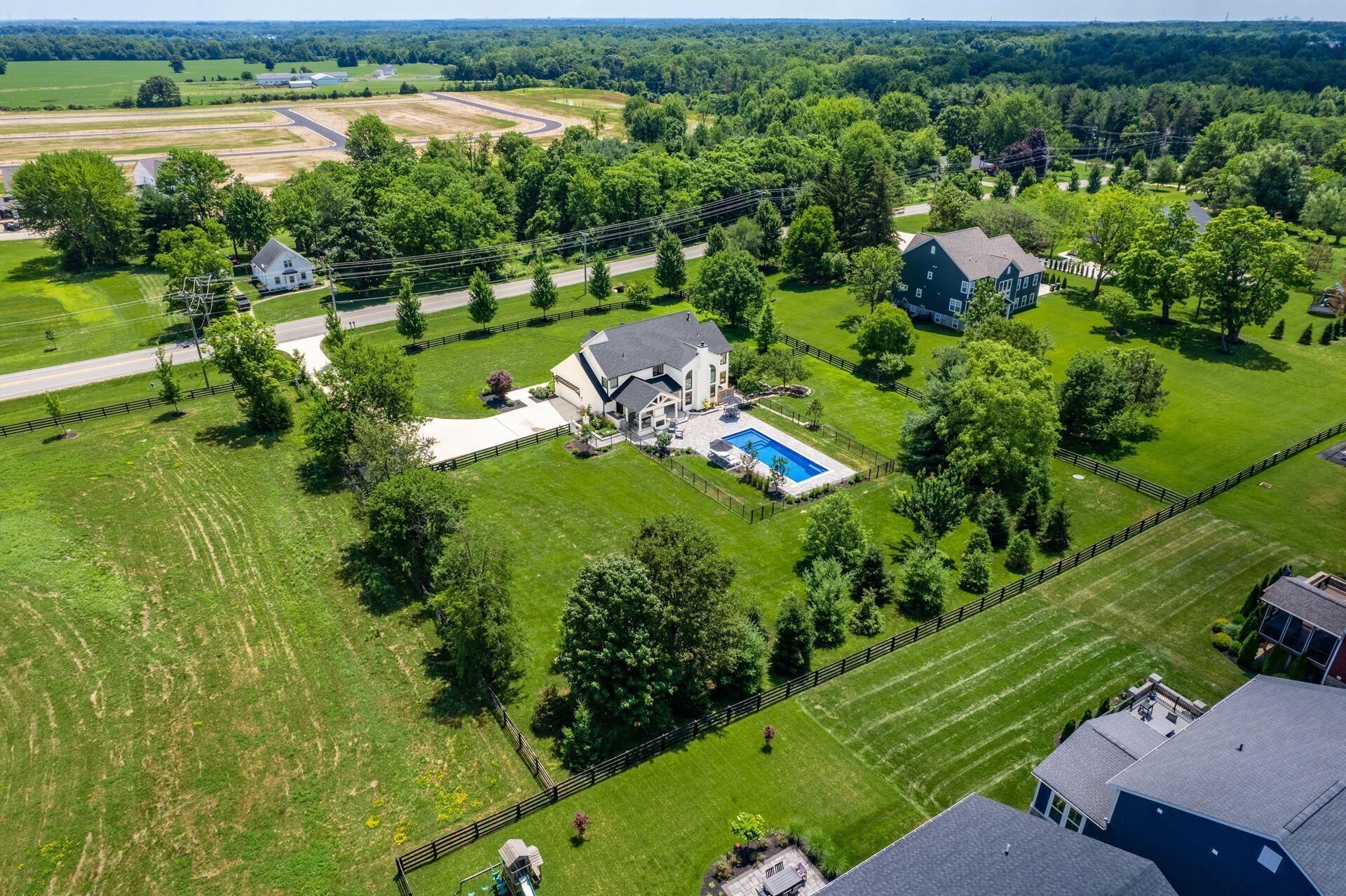 Exceptional Jerome Village property offering over 1.6 acres, extensive updates, and a thoughtfully designed indoor-outdoor living experience. Extensively improved with over $800,000 in documented updates, this home reflects a significant investment in both lifestyle and long-term quality, including a resort-style outdoor environment, major system upgrades, and high-end window and door replacements.The outdoor living space is a true extension of the home, featuring an in-ground pool, covered porch with wood ceiling detail, built-in fireplace, and expansive professional hardscaping--designed to extend outdoor living well beyond the typical season.Inside, the home offers an open and functional layout with updated flooring, fresh interior paint, and abundant natural light. The kitchen anchors the main living space with an island, ample cabinetry, and clean, modern finishes, flowing easily into the adjoining living and dining areas. A dedicated drop zone/mudroom off the garage adds everyday convenience and organization.The finished walkout lower level expands the living space with a large recreation room, fifth bedroom, full bathroom, and a dedicated fitness room, offering flexible use options.Additional improvements include Marvin wood-clad fiberglass windows and doors, roof replacement, HVAC updates, and a concrete driveway and walkways--contributing to the overall quality and condition of the property.Situated within Jerome Village with access to community amenities and located within the Dublin City School District, this property offers a rare combination of space, updates, and outdoor living.