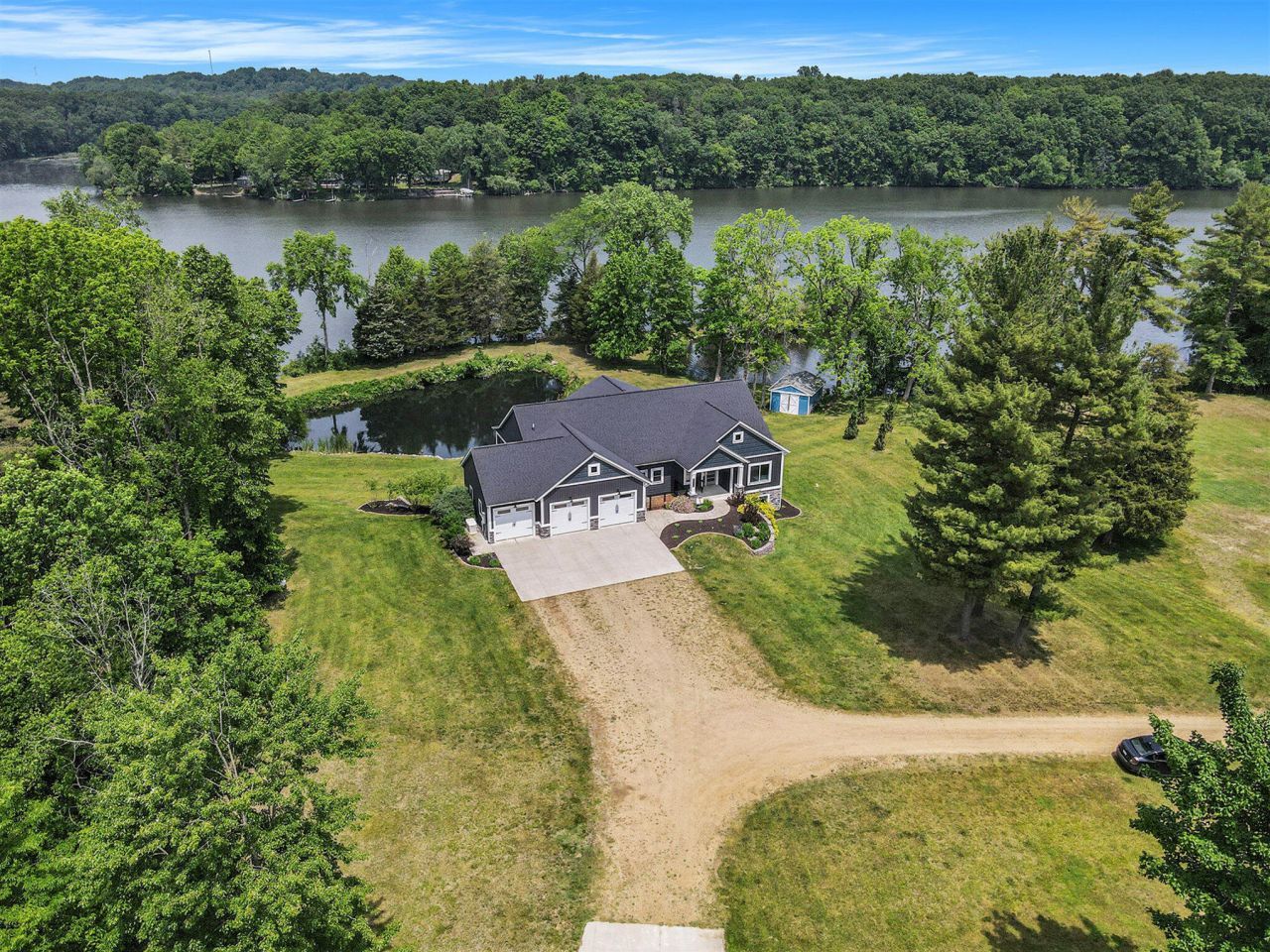 Tucked at the end of a private road on over 2 wooded acres with nearly 500 feet of prime Lake Allegan frontage, this like-new 2019 custom-built home offers the perfect blend of luxury, privacy, and everyday livability--all less than three hours from downtown Chicago. Designed as a forever home, every detail was thoughtfully considered--from the zero-barrier entry and gentle, stair-free slope to the waters edge, to the expansive layout ideal for multi-generational living. Inside, youll find 4 bedrooms, 3 full bathrooms, and over 3,400 square feet of beautifully finished space. Vaulted ceilings and industrial-sized windows bring the outdoors in, flooding the home with natural light and offering stunning views of the lake and private pond from nearly every room. The open-concept main