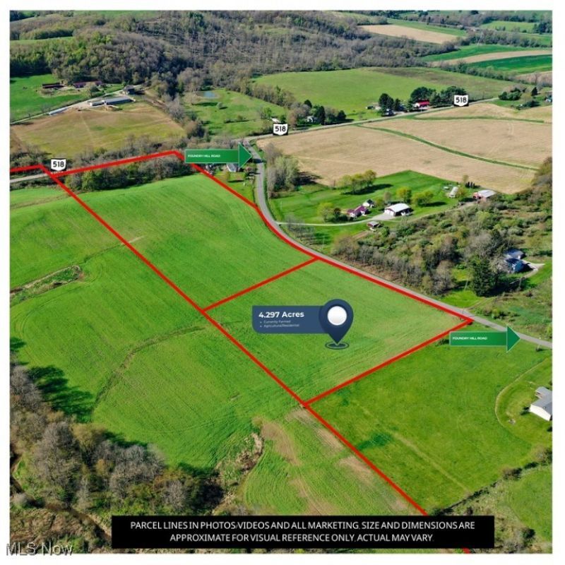 Endless Potential on 4.297 Acres-Agricultural/Residential Development Opportunity | Columbiana County | Southern Local School District. This level, *tillable 4.297 Acre parcel is currently being used for crop farming providing income until you expand your farming operation or are ready to build your dream home where you can enjoy sustainable living, hobby farm, boutique operation or develop with several beautiful homesites. Frontage on Foundry Hill Rd. This property is available individually or as part of a larger offering totaling approximately 105.852 acres when combined with adjoining parcels. It's an excellent opportunity for developers, investors or anyone seeking space, privacy and multiple options for use. Acreage by parcel with MLS# , 5129999 (4.297 AC.), 5130001 (8.91 AC.), 5130009 (13.65 AC.), 5130011 (78.995 AC.) , and 5132328 (105.852 AC. Combined). PLEASE NOTE: Any applicable Gas, Oil, Coal, Timber and Mineral Rights are Negotiable. HIGHLIGHTS INCLUDE: 4.297 Acres (partially level, usable terrain *4 +/- AC. Portion tillable (Currently planted, farmer will harvest current crop). Don't miss this opportunity to own a versatile piece of land that offers flexibility, functionality and long-term promise. Call today for more information. Parcel lines in photos/videos and all marketing (size and dimensions) are approximate for visual reference only, actual may vary. This property is owned by a trust affiliated with a licensed real estate agent/REALTOR® in the state of Ohio. The licensed agent/REALTOR® also maintains a business relationship with the listing agent and brokerage. ALL LAND IS CURRENTLY PLANTED IN CROPS PLEASE DO NOT WALK THE PROPERTY WITHOUT PRIOR COMMUNICATION AND APPROVAL. SHOWINGS BY APPOINTMENT ONLY. CONTACT THE LISTING AGENT TO SCHEDULE A VISIT.